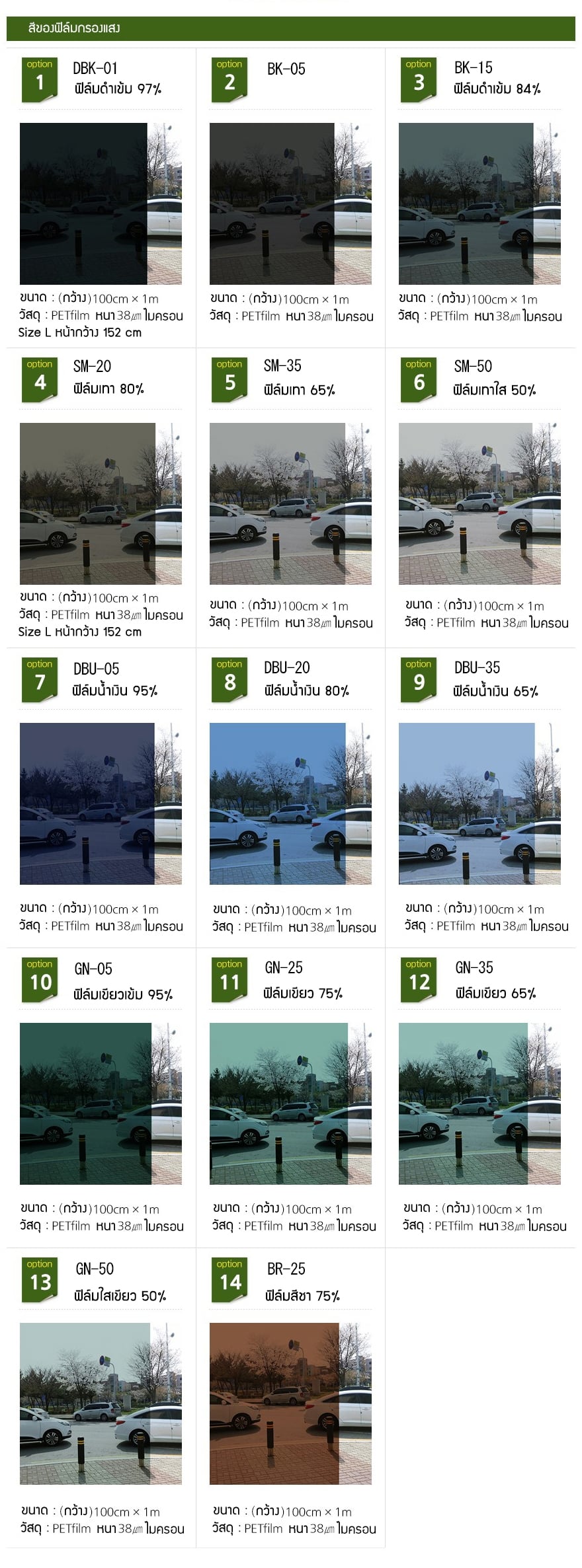 - BK-15/ SM-20/ GN-25 /DBU-20 /BR-20 เป็นฟิล์มกรองแสงประมาณ 75-80% ค่อนข้างเข้มแต่ไม่มืดมาก ป้องกันความร้อนได้ 33-34%